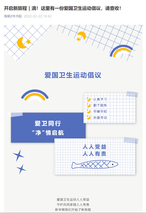 书院依托微信公众平台,从精神内涵解读、卫生运动号召以及个人习惯养成三个方面宣传新时代爱国卫生运动精神,引导学生积极学习相关内容并参与爱国卫生运动。