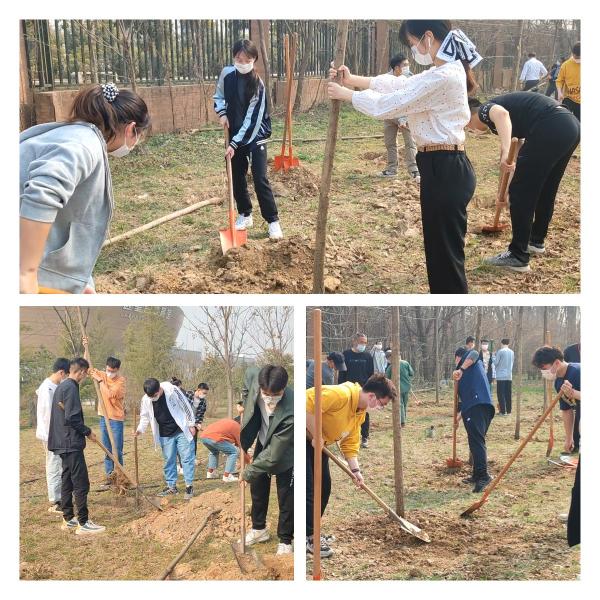 植树活动安排在学校博物馆南侧,在后勤保障部工作人员的指导下,师生三五人一组,井然有序,个个干劲十足,现场一片热火朝天的景象。大家一起挥锹培土,认真地扶正树苗、踩实新土、灌溉浇水,让一棵棵树苗稳稳扎根,茁长成长。