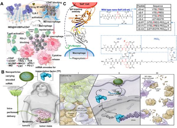 癌症严重威胁人类生命安全。传统的治疗手段如手术、放疗和化疗等对高复发率、高转移率的癌症治疗效果有限。当前,免疫治疗引起了研究者的极大关注。癌症免疫疗法通过药物激活宿主免疫系统,在此过程中形成的免疫记忆可有效地抑制肿瘤的复发和转移。近年来,基于免疫检查点抑制剂(ICI)、嵌合抗原受体T细胞(CAR-T)工程等的小规模试验取得了显著成功,极大地推动了免疫治疗的应用。然而CAR-T疗法存在一些局限性,如肿瘤浸润效率低,由于免疫编辑导致靶向抗原丢失,受免疫抑制微环境限制等。