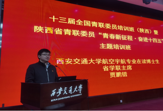 贾鹏锴,航天航空学院航空宇航科学与技术专业2018级博士研究生。曾任陕西省学生联合会主席、西安交通大学研究生会主席、博士航空宇航党支部书记。一直以来,他坚持严以律己,自强不息,勇攀高峰,坚持理论联系实践,以饱满的热情面对科研和生活,努力践行社会主义核心价值观,在坚定理想、热爱祖国、砥砺奋斗、服务同学等方面不断进取,发挥了较好的表率作用。他多次前往井冈山、延安、梁家河、兰考县学习体悟井冈山精神、延安精神、焦裕禄精神等,参研学校思政工作创新研究课题——学联学生会改革背景下的大学生骨干培养路径探索研究,协助学校创立“新港·新干·新秀”培训班,为学校构建完善的研究生骨干培养体系作出了重要贡献。作为党支部书记,带领博士航空宇航党支部获评全国高校“百个研究生样板党支部”。担任研究生会主席期间,他积极组织开展“创源”科技学术论坛、Withinker Salon、学术辩论赛、“学术之星”评比和“交大榜样——优秀学子报告会”,倡导研究生在学习和科研中以榜样为楷模,在科研中面向国家需要解决工程实际问题。担任省学联主席期间,通过宣讲研讨、政策解读、调研走访、督导落实切实增强陕西学联学生会组织的政治性、先进性、群众性,以身作则,带头抵制不良风气,有效改善了陕西各级学生组织的形象与作风,收获了各学校老师同学的一致好评。