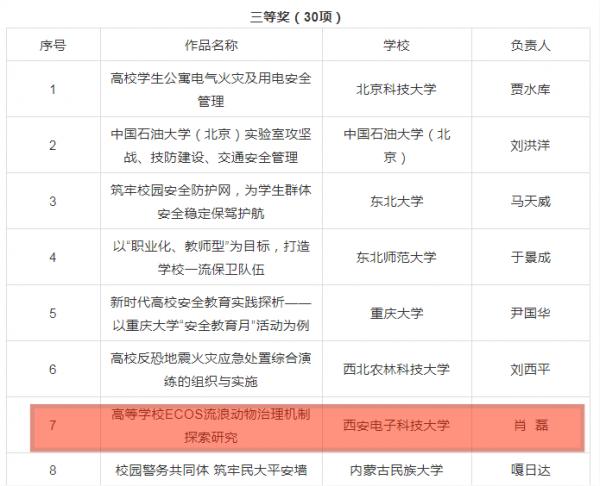 近日,由教育部思想政治工作司和中国高等教育学会共同指导,全国高校思想政治工作网、中国高等教育学会保卫学专业委员会、高校思想政治工作队伍培训研修中心(高等教育出版社)联合举办的“2021年高校平安校园建设优秀成果研讨展示活动”评审结果公布。西安电子科技大学党委安全保卫部/保卫处肖磊提交的《高等学校ECOS流浪动物治理机制探索研究》,荣获典型案例三等奖(学校首次)。
