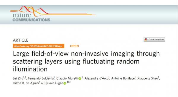 近日,西安电子科技大学光电工程学院邵晓鹏团队联合法国Sorbonne Université的SylvainGigan教授在国际光学顶级期刊《Nature communications》刊发了题为“Large field-of-view non-invasive imaging throughscattering layers using fluctuating randomillumination”的文章,利用时变随机照明实现了透过散射介质超光学记忆效应范围的非侵入式成像,解决了散射自相关成像技术中光学记忆范围受限的难题,为计算照明领域的一大突破。西安电子科技大学在读博士生朱磊为第一作者,SylvainGigan教授为通讯作者。