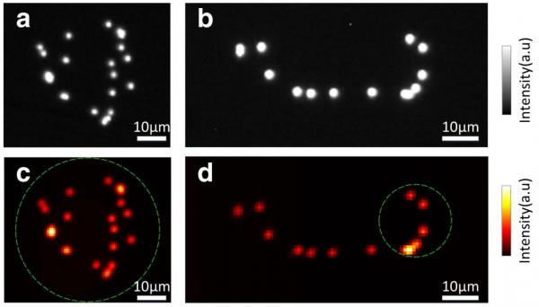 (a-b)荧光目标(无散射介质);(c-d)重建图像。虚线圆圈表示光学记忆效应范围