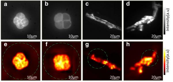 (a-d)复杂荧光目标(无散射介质);(e-h)重建图像。虚线圆圈表示光学记忆效应范围