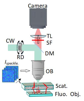 实验系统示意图。连续激光器的输出光经过准直后照射至旋转散射介质进行随机调制,经过调制后的光通过光学系统照明荧光目标,荧光目标被激光后产生荧光信号并且荧光信号反向传播,被探测器所接收。其中,RD:旋转散射介质,DM:二向色散镜,OB:物镜,Scat.:散射介质,Fluo. Obj.:荧光目标,SF:光谱滤波片,TL:镜筒透镜。