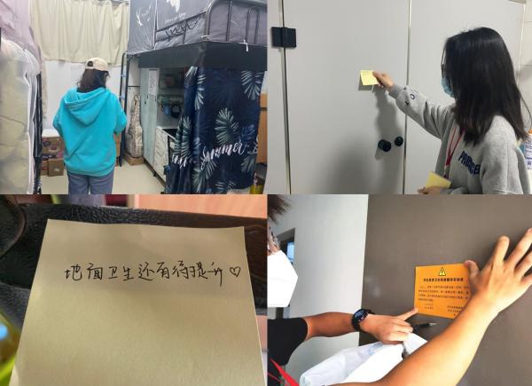 在检查工作中,检查团队学生认真负责,一方面严格执行检查标准,对宿舍地面卫生不达标、东西摆放混乱、存在违章电器等问题一一记录,并拍照上传至检查平台,并对存在问题的宿舍张贴告知单;另一方面,创新工作方法,通过粘贴便签字等温馨有效的方式对卫生存在较轻问题的宿舍进行提醒,旨在帮助同学做好宿舍卫生整改。