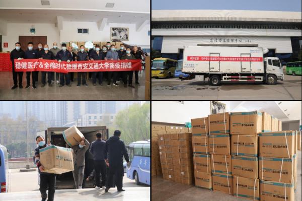 3月23日,全棉时代联合母公司稳健医疗向西安交大捐赠了价值近70万元的防疫物资,包括医用口罩、灭菌卫生湿巾、卫生巾等。