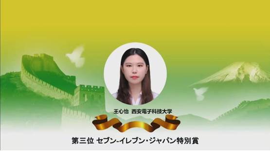 总决赛分为命题演讲和即时问答两个环节,日语系王心怡同学在日语系教师马静雯指导下,以“新冠抗疫给我的启示”为主题,讲述了在新冠疫情中感受到的团结之力,并在即时问答环节就“是否赞成为了减轻对环境的负担而应该减少肉类消费”阐述了自己的见解。最终,凭借深厚扎实的语言功底、严谨独到的演讲内容与沉稳大方的临场表现,获得总决赛季军(セブン?イレブン?ジャパン特別賞)。