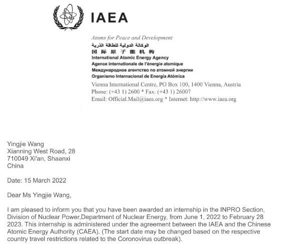 3月15日,西安交大能动学院博士生王莹杰被国际原子能机构(IAEA)核动力司创新型核反应堆与燃料循环国际项目(INPRO)录取,将于今年6月1日起在日内瓦开始为期9个月的实习工作。该生实习项目材料通过专家评审,获得由国家留学基金管理委员会(CSC)提供的公派实习资格。