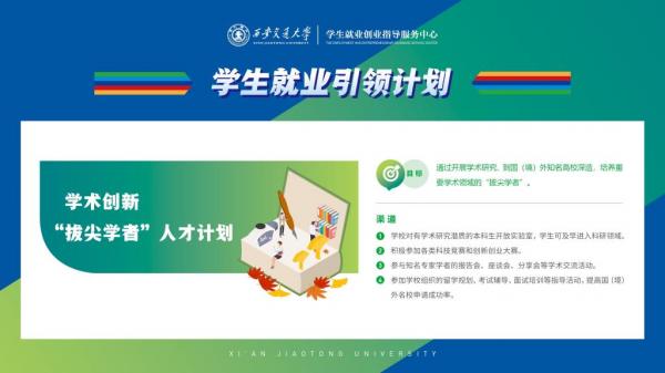 各书院和学院的职业发展工作室,则是推进“五个就业引领计划”落地落实的有力抓手。在“计划”的引领下,工作室结合书院、学院学生特点,做好就业指导服务的同时,加强对学生使命感责任感的培养,引导学生在择业就业、事业发展中传承弘扬西迁精神,将个人发展融入国家事业。目前,学校已在书院、学院建立了10个工作室,计划今年再新建5个。