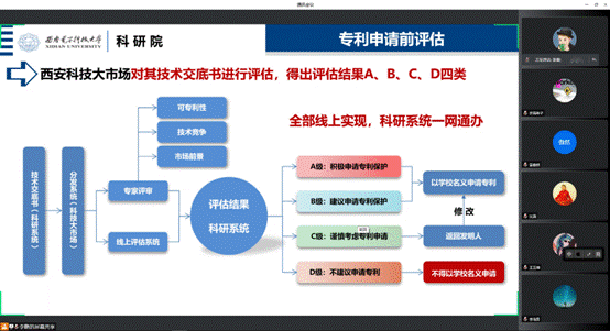 为加快做好专利申请前评估工作,持续优化完善专利申请前评估工作方案,让广大师生更加清晰、更加客观的认识专利申请前评估工作,同时也为了更加细致、更加全面的了解广大师生对学校开展专利申请前评估工作的建议,科学研究院于3月18日至25日,面向全校师生针对专利申请前评估工作开展了十场线上专题宣讲会,就学校专利申请前评估工作方案与广大师生进行了深入研讨交流。会议由科学研究院科技成果管理处处长沈满主持,科学研究院副院长、成果与科技开发管理部部长张毅参加会议,各学院科研副院长、科研干事、科技奖励办全体成员及广大师生共计1000余人参加会议。