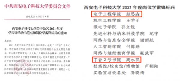 为弘扬新时代雷锋精神,赓续传承中国共产党人的精神谱系,学校开展了2021年度学雷锋活动示范点和岗位学雷锋标兵推优评选工作。经组织推荐、材料审查、综合评议、校内公示,通信工程专业2019级学生高永凯、电子信息工程专业2019级学生赵思垚等10名师生获“西安电子科技大学2021年度岗位学雷锋标兵”称号。