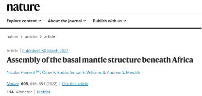 我校与澳大利亚、英国科研机构合作,于伦敦时间2022年3月30日在国际著名期刊Nature发表题为Assembly of the basal mantle structure beneath Africa的文章。该文章由我校地质学系Simon Edward Williams教授与澳大利亚卧龙岗大学Nicolas Flament博士和?mer F. Bodur博士以及英国利兹大学Andrew S. Merdith博士合作发表,Simon Edward Williams教授为第三作者。
