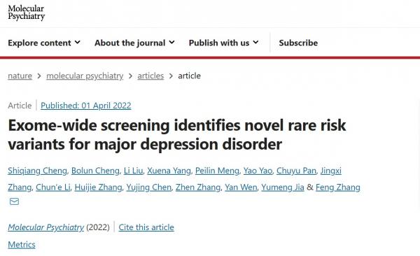 该成果以《全外显子筛查鉴定了抑郁症的新罕见遗传变异》(Exome-wide screening identifies novel rare risk variants for major depression disorder)为题在精神病研究领域权威期刊《分子精神病学》(Molecular Psychiatry)(IF=15.99)在线发表。公共卫生学院博士生程仕强是论文的唯一第一作者,张峰教授是论文的唯一通讯作者。西安交通大学医学部公共卫生学院、国家卫建委微量元素与地方病研究重点实验室、教育部环境与疾病相关基因重点实验室、陕西省疾病防控与健康促进重点实验室为论文的第一作者和通讯作者单位。上述工作得到了国家自然科学基金优青项目的资助。