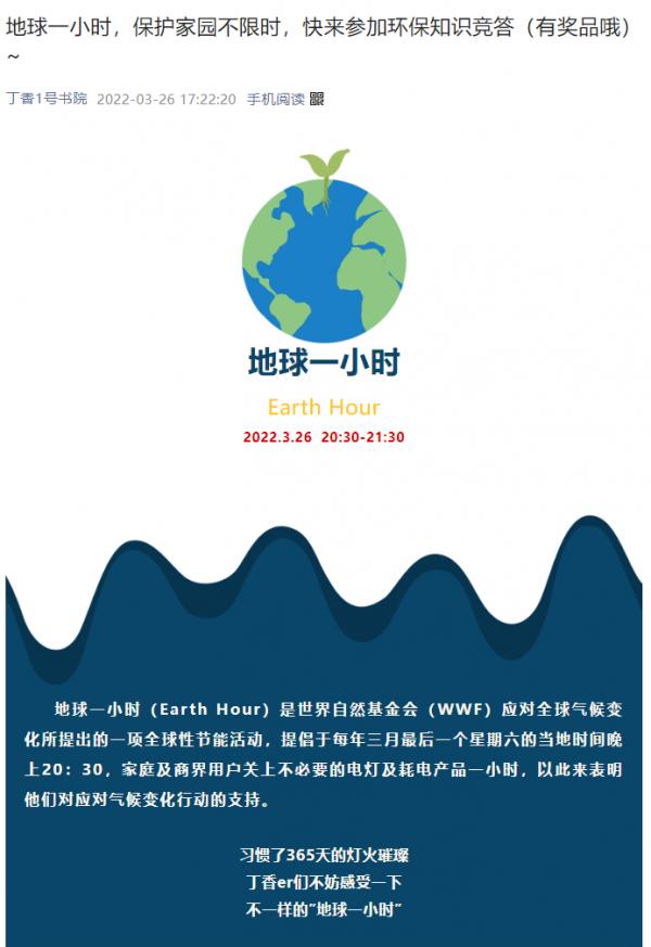为普及生态环境保护知识,倡导高校青年积极参与到生态文明建设中,做生态文化的传播者,绿色发展的推动者。在3月26日世界地球日之际,丁香1号书院开展地球1小时线上环保知识竞答活动,通过介绍世界地球日的意义、主题、做法,呼吁书院学子参与到节能减排的实际行动中,通过自身实际行动提升环保意识,做环境保护的践行者。