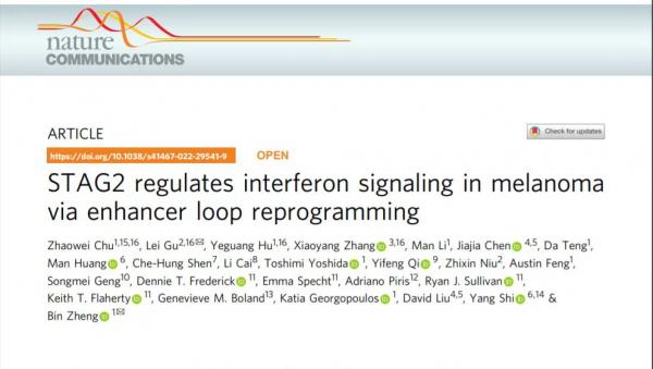 该研究成果日前在国际著名期刊《自然通讯》(Nature Communications)发表,题目为《STAG2在黑色素瘤中通过重编程增强子环调控干扰素信号》(STAG2 regulates interferon signaling in melanoma via enhancer loop reprogramming)。西安交大二附院皮肤科储召娓博士为该文章第一作者,德国马普所顾磊博士、复旦大学张晓阳博士及哈佛大学麻省总医院胡业广博士为本论文共同第一作者,耿松梅教授为参与作者,哈佛大学麻省总医院郑斌教授为通讯作者,顾磊博士为共同通讯作者。
