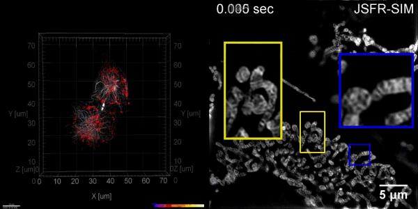 另外,雷铭教授团队还将该算法与自行研制的超分辨结构光照明显微镜结合,对活体COS-7细胞进行了实时观测,并捕捉到了微管的动态组装与解体过程以及快速的线粒体制管过程。该方法为实时观察活细胞中细胞器与生物大分子的动态过程提供了一种快速的重建手段,有望大幅简化超分辨显微镜使用者的工作流程,提高相关科学工作者的成像效率,从而促进SR-SIM在生物医学实验室的广泛应用。相关技术目前已授权和正在申请多项国家发明专利,系统工程样机也已经研制完成。