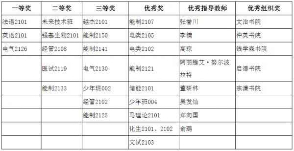 最终,彭康书院法语2101班、英语2101班,仲英书院电气2126班荣获本次比赛的一等奖,文治书院未来技术班等五个班级获得二等奖,钱学森书院越杰2101等七个班级获得三等奖,彭康书院能制2107等九个班级获得优秀奖,文治书院等五个书院获得优秀组织奖,张誉川老师等八名老师荣获优秀指导教师奖。