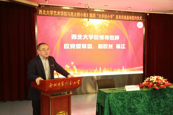 常江在讲话中表示,学校一贯重视将理论与实践相结合作为培养高素质学生的有效途径,支持学院积极探索协同育人模式,推动健全美育教育教学体系。他指出,办“大学里的小学,小学里的大学”是附属学校对“如何突出大学的附属学校特色”进行的深入思考,在国家的“双减”政策下,采取这种合作方式开设丰富多彩的美育实践课程,既是对大学生就业能力、社会担当、奉献精神的提升,也是对国家教育政策的进一步落实和实践。他强调双方要以此次签约为起点,将活动做实、做细、做好,善于总结经验、凝练提高,办出特色、办出成效。
