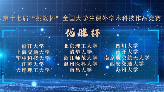 本届“挑战杯”硕果累累,主体赛、红色专项活动、“揭榜挂帅”专项赛、“黑科技”专项赛等各赛道共吸引全国高校参赛2984次,进入全国层面参赛作品4500余项。在主体赛中,西安交大获一等奖3项、二等奖2项、三等奖1项,获奖成绩近15年最佳。在黑科技专项赛中获“星系”级(特等奖)2项、“恒星”级(一等奖)3项、“行星”级(二等奖)1项、“卫星”级(三等奖)3项,获奖总数居C9高校第1、全国前5;在“挑战杯”红色专项活动中获二等奖1项、三等奖1项。获评优秀组织奖,并与清华大学、浙江大学等高校一同捧得大赛“优胜杯”。