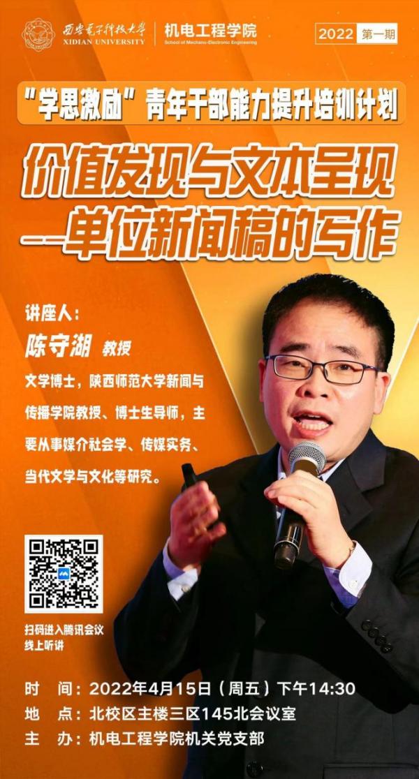 “学思激励”青年干部能力提升培训计划首期讲座邀请到陕西师范大学新闻与传播学院博士生导师陈守湖教授作了题为《价值发现和文本呈现—单位新闻稿的写作》的专题培训,从价值发现与文本呈现两个角度出发,帮助青年干部提升在融媒体时代下的单位新闻稿撰写能力。