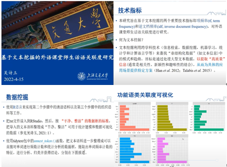 吴诗玉教授循序渐进、娓娓道来,首先介绍了“外语课堂话语”的相关概念及其研究的重要性,接着梳理了研究背景、文献综述和现有研究不足,进而提出了本研究的研究问题:1、从单词使用频率的角度看,课堂话语各角色之间的话语关联度如何?2、从话语用词承载的信息权重角度看,课堂各角色之间话语的关联度如何?为此,本研究基于R语言的文本挖掘技术手段,以两个平行班级的完整课堂话语作为研究对象,以单词频率(tf)和单词的tf_idf值为技术指标,旨在研究课堂话语中各角色话语的关联度,从而探讨外语教师课堂话语的促学问题。在研究设计部分,吴教授重点呈现了用R进行数据挖掘的实现路径并展示了相关语料和数据处理的过程。最后,本研究发现从单词频率的总体指标看,两个平行班级的师生话语都与参照话语显著相关。但是,从课堂话语中各角色话语所用单词所承载的信息权重看,两个平行班级的师生话语都“离题”了,师生话语并没有触及到他们所学课文中由最重要的词语所定义的核心内容,关联度很低。不过,两个平行班级的教师话语都表现出与学生积极互动并对学生积极反馈的促学特征。