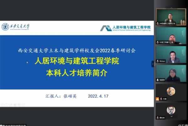 4月17日上午,西安交通大学土木与建筑学科校友会2022年春季研讨会于线上召开。土木与建筑学科校友会会长刘斌、秘书长王卫星、西安交通大学校友关系发展部副主任赵力、人居学院党委书记杨鹏、常务副院长顾兆林、副院长许领以及人居学院系所领导、校友会理事、教师及校友代表参加本次会议。会议由人居学院副院长、土木与建筑学科校友会执行秘书长张硕英主持。