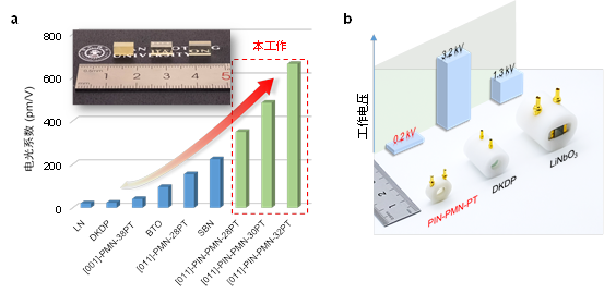 b.基于PIN-PMN-PT单晶研制的电光调Q开关,作为对比,图中给出了商用DKDP单晶和铌酸锂单晶电光开关照片和工作电压。