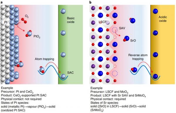 文章中基于基底原子捕获策略发展了一种与传统方法不同的逆向原子捕获方法,将商业LSCF粉体材料与酸性MoO3进行共混高温煅烧,导致LSCF的界面Sr离子被MoO3捕获形成SrMoO4和在LSCF中形成Sr/O空位(