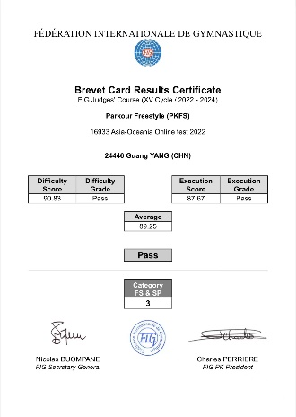 国际级裁判考试是国际裁判领域最高级别的认证考核,根据国家体育总局体操运动管理中心《关于选派裁判参加2022-2024周期国际跑酷裁判班的通知》文件要求,为适应国际各级各类技巧、跑酷比赛需要,提升技巧、跑酷裁判员队伍的梯队建设,体育总局体操运动管理中心选派裁判参加本次国际技巧、跑酷裁判班。杨光通过资格审查、初试、复试等环节,取得了优异的成绩并获得跑酷国际级裁判员称号。