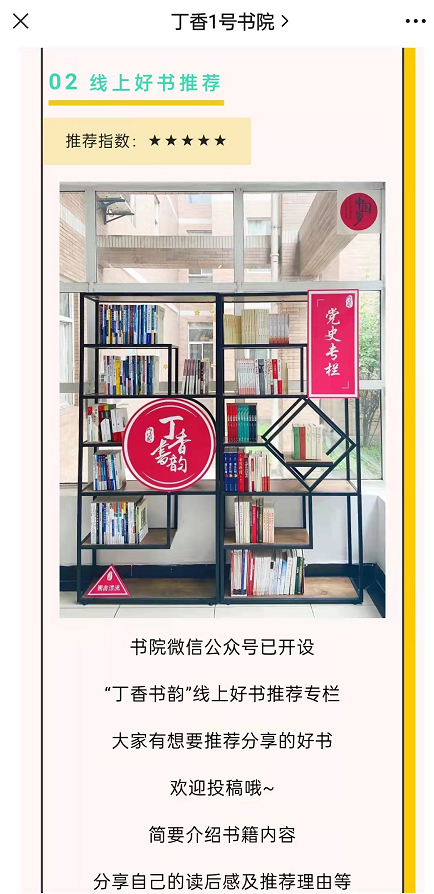 去年“世界读书日”之际,书院推出了“丁香书韵”专栏,通过线上推荐好书、线下设立读书漂流书柜引导学生多好书、读好书。自“丁香书韵”推出以来,全书院师生积极推荐,累计数量到达27本,书院为推荐者免费购买书籍,并将所推荐书籍添加至一楼大厅书院供全书院学子阅读使用。今年,书院继续鼓励学生推荐好书,书院学子可通过投稿的方式,将书籍名、推荐理由、简要介绍、读后感等内容发送至书院邮箱,投稿一经被书院选登后,书院将免费赠送其想看书籍。同时,被选登的书籍书院将在第一时间购买,随后上架到一楼大厅丁香书韵专栏,供全书院学生阅读,让每一位书院学生都能阅读到好书,感受阅读的魅力。