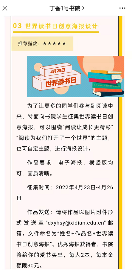 为丰富活动内容,创新活动形式,让更多学子了解和参与到“世界读书日”活动中,书院推出了“世界读书日创意海报设计”,参与者可以围绕“阅读让成长更精彩”“阅读为我们打开了一个世界”等主题自行设计海报,书院将为优秀海报设计者的爱书买单,同时在书院一楼大厅循环播放海报。海报设计大赛既需要学生发挥充分的想象力,又锻炼了学生的动手实践能力,加深了对“世界读书日”的认知,提升了学生的审美鉴赏。