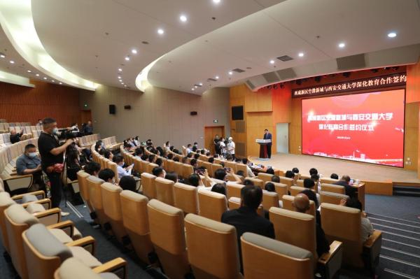 西咸新区教育体育局,空港新城党委、管委会、空港集团、城发集团班子成员及空港新城各服务支撑机构及辖区部分中小学校长代表,西安交通大学党、校办(地校合作办),人力资源部、学生处、就创中心、干部教育培训基地、网信中心、继续教育学院、基础教育党委、社会教育管理处、附属中小幼等相关单位负责人参加签约仪式。
