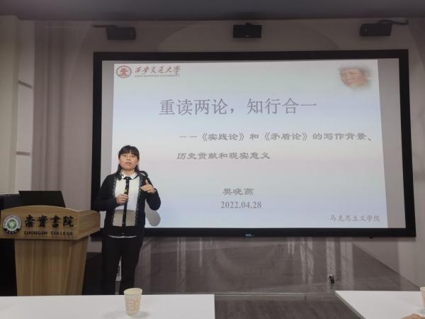 马克思主义学院樊晓燕副教授首先作了以《重读两论,知行合一——<实践论>和<矛盾论>的写作背景、历史贡献和现实意义》为题的专题讲座。樊老师从自己少时读两论的经历谈起,分别介绍了《矛盾论》和《实践论》的写作背景、主要内容、历史贡献及现实意义。樊老师提出,“两论”写作于中国革命的实践和理论逐渐走向成熟的过程中,《实践论》对马克思主义认识论进行进一步发展,提出认识与实践的规律。《矛盾论》全面系统论述唯物辩证法关于对立统一规律的基本原理。最后,樊老师提出,通过阅读《实践论》和《矛盾论》,我们应当重视经典理论学习,提升理论素养;不断深入实践,重视调查研究;培育宏阔视野,掌握科学的方法。