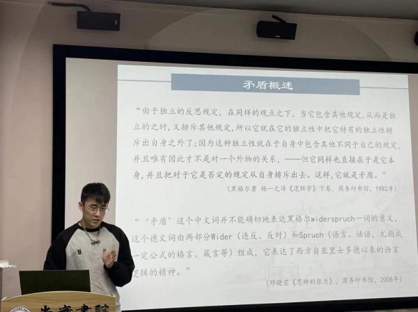 接下来是两位本科生同学的分享。韩良弼同学以《合二为一与一分为二——黑格尔与毛泽东矛盾观之比较》为题,在与黑格尔的比较中突出毛泽东《矛盾论》的特色。他以第五次反围剿失败为例,指出教条主义者机械照搬军事理论,不顾矛盾特殊性,进而造成巨大损失的谬误。最后,韩良弼总结到,毛泽东的“一分为二”不仅是一种斗争哲学,也是一种在诸多不定因素中找到一条出路的思维方式。