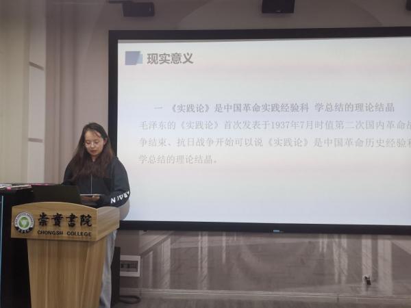 朱勒德孜·努尔别克同学简要介绍了《实践论》和《矛盾论》写作的国际国内背景,对“两论”的主要内容进行了归纳总结,分析了《矛盾论》和《实践论》两本著作在当代的现实意义,《实践论》是发展马克思主义哲学理论的典范。