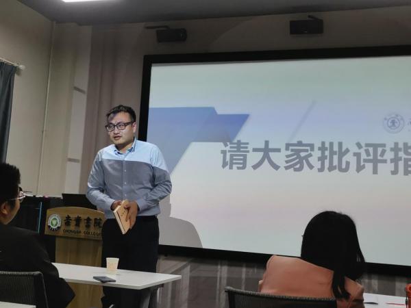 马克思主义学院刘源老师分享了自己的收获。两篇文章当中,刘老师认为从《实践论》出发,只有正确认识知与行之间的关系,才能为理解《矛盾论》打好基础,了解矛盾之间究竟是怎样转化的。刘老师号召大家领会“学哲学,用哲学”六字真言,其中最关键的就是“用哲学”,刘老师结合个人经历,讲解了如何将学习的经典应用到生活中,指导我们更好地进行实践。苟日新,日日新,又日新,经典就是要反复阅读,才能知晓明晰其内部之旨趣。