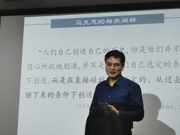 冯晔助理教授以《再谈<实践论>和<矛盾论>》为题,从为了什么而作、包含什么内容、“两论”的智慧三个方面对《实践论》《矛盾论》进行了深入剖析。冯老师提出,“两论”的创作都基于当时如何认识马克思主义基本原理,如何结合中国革命具体实践的现实需求。同时冯老师也讲到,“两论”的产生也离不开毛泽东个人丰富的实践经验、深厚的理论基础和精深的传统文化修养。冯老师从古希腊哲学谈起,通过简要介绍“流射说”“影像说”“白板说”“观念说”“实体说”等认识论发展史,说明了马克思主义在认识论领域的发展,进一步指出了毛泽东“两论”在哲学发展史与中国革命实践中的原创性贡献。