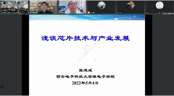 为加强名师引领,开阔专业视野,厚植家国情怀,值五四青年节之际,副校长张进成教授为2021级电子信息类本科生作报告,与同学们畅谈芯片技术与产业发展。报告采用线上线下相结合的方式进行,千余名学生通过直播平台收看,活动由微电子学院副院长胡辉勇主持。