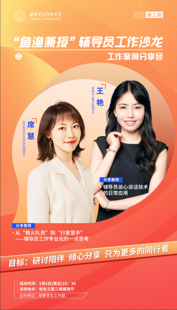 原通信工程学院辅导员王艳与原空间科学与技术学院辅导员席慧分别以《辅导员谈心谈话技巧的日常应用》《从“救火队员”到“行家里手”——辅导员专业能力提升的一点思考》为题做工作经验分享。