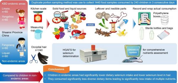 西安交通大学公共卫生学院地方病研究所郭雄教授团队宁玉洁副教授与陕西省地方病防治研究所副主任技师杨晓栋等科研人员合作,采用双份饭法、氢化物原子荧光光谱法(HG-AFS)、CDGSS3.0膳食营养素计算软件等发现病区儿童发硒含量均值达非病区标准,但仍显著低于非病区,且膳食结构相对单一,硒摄入量贡献食物种类少,同时存在脂肪、胡萝卜素、视黄醇当量、维生素A/B2/C/E、钾、钙、铁、铜、碘等多种营养素失衡,可能影响病区儿童的生长发育。研究结果明确了病区儿童硒及综合营养现状和膳食结构缺陷,并为停止硒盐防治大骨节病措施后病区儿童健康管理工作重心如何转变提供依据。该研究成果以《采用双份饭法调查分析陕西省大骨节病病区儿童硒营养状况及膳食结构》“Investigation of selenium nutritional status and dietary pattern among children in Kashin-Beck disease endemic areas in Shaanxi Province, China using duplicate portion sampling method” 为题在国际权威期刊《环境国际》(Environment International)在线发表。公共卫生学院宁玉洁副教授为该论文第一作者,论文第一作者单位为西安交通大学医学部公共卫生学院。公共卫生学院硕士研究生胡敏涵为本研究共同第一作者,陕西省地方病防治研究所杨晓栋副主任技师与公共卫生学院郭雄教授为共同通讯作者。