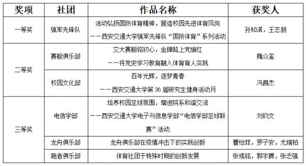 经过大众评审和嘉宾评委的综合评定,强军先锋队、学生赛艇俱乐部、研究生会校园文化部、电信学部足球队、龙舟俱乐部、跑者俱乐部提交的6个作品分别获得一、二、三等奖。