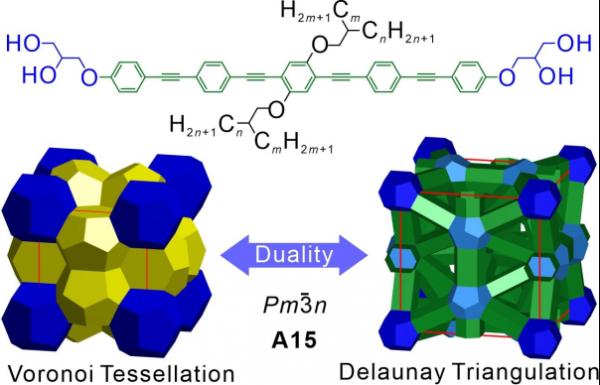 近期,西安交通大学材料学院刘峰教授团队与德国哈勒维滕贝尔格马丁路德大学Carsten Tschierske教授合作,在以棒状基元为核心的不对称星形多亲性分子中,首次发现基于四面体网络结构的A15立方相。分子结构如图所示,核心为棒状低聚亚苯基亚乙炔基(OPE),两端为极性的丙三醇形取代基,侧链为非对称支化脂肪链。通过运用差示扫描法、偏光显微镜以及同步辐射小角X射线散射等测试方法,对该结构进行了详细的表征和分析。该结构对应于A15晶胞的德洛奈三角剖分(Delaunay Triangulation,DT),为常见Weaire-Phelan结构的拓扑学对偶,因此通过适当的拓展可以制备其它结构的FK相甚至液态准晶结构。
