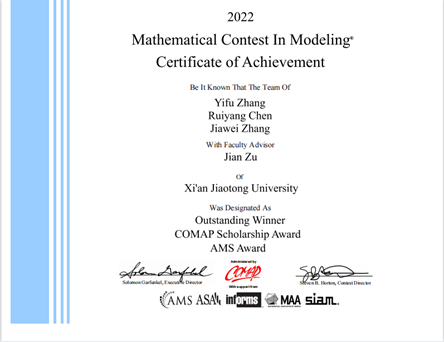 近日,2022年美国大学生数学建模竞赛和交叉学科建模竞赛(MCM/ICM)成绩揭晓,西安交大学子获美国数学及其应用联合会学术奖(COMAP Scholarship Award),全球仅有来自哥伦比亚大学、纽约大学、大连理工大学以及西安交通大学的4支参赛队伍获得该奖项。西安交大参赛学生还获得大赛Outstanding Winner奖(最高奖)1项、Finalist奖(次高奖)14项、Meritorious Winner奖22项、Honorable Mention奖38项。