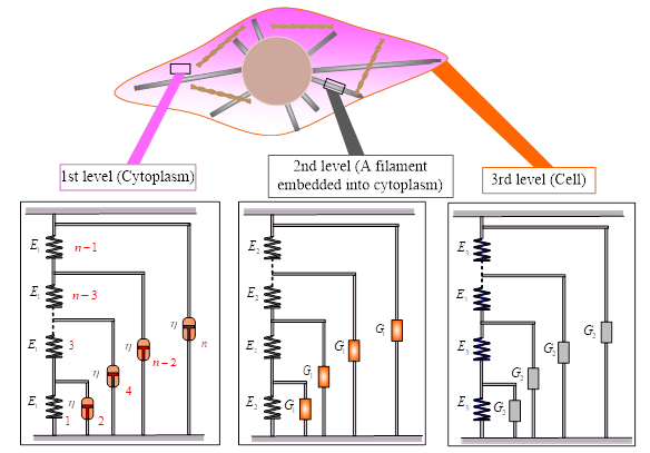 为了探究细胞在不同频率尺度下的流变学行为,西安交通大学徐光魁教授团队通过考虑细胞骨架的多级结构特征,建立了细胞的自相似多级结构模型。结合实验结果发现,在低频率下,细胞的储能模量和耗能模量均表现出对频率的弱幂律依赖性;在高频下,储能模量近似为常数,而耗能模量与频率成线性关系。此外,自相似多级结构模型的转折频率可以描述不同细胞状态或类型的粘弹性力学响应差异,还可以定量地表征恶性肿瘤细胞与健康细胞的差异。