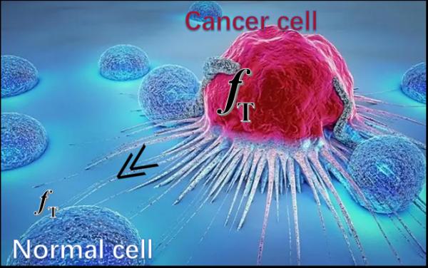 本研究通过对比癌变细胞和正常细胞在频域内的流变学行为发现,恶性肿瘤细胞的粘性系数与正常细胞相比略有减小,恶性肿瘤细胞骨架的紊乱和解聚导致了细胞骨架三维网络结构的极大破坏,使得三级结构的弹性模量从2.46 kPa几乎下降到0。除了弹性模量之外,本研究还发现二者的转折频率也具有明显的差异,恶性肿瘤细胞的转折频率远远高于普通细胞的转折频率。使用自相似多级结构模型对肿瘤细胞的流变学特性进行表征可以用力学性能参数定量地表示其与正常细胞之间的差异。将粘弹性力学性能与生物因素联系起来,将更接近使用力学指标作为早期癌症诊断的标志。