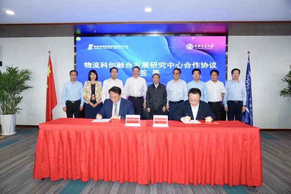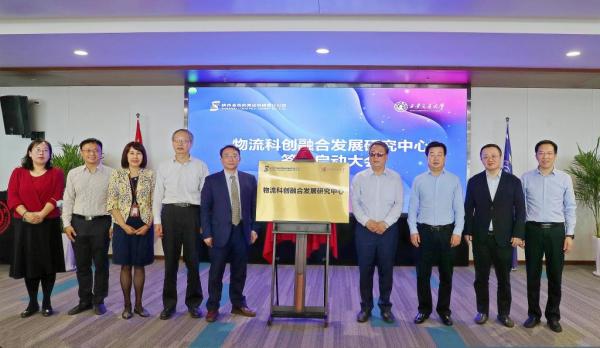 席光、高暐代表双方签署战略合作协议。西安交大校长王树国、省国资委党委书记刘斌、省物流集团董事长王增强、西安交大管理学院院长冯耕中等为物流科创融合发展研究中心揭牌。