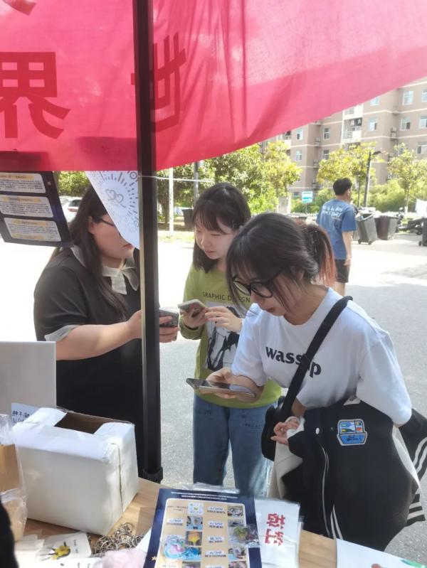 来往的同学们在此驻足,向志愿者询问商品信息,扫码献出爱心