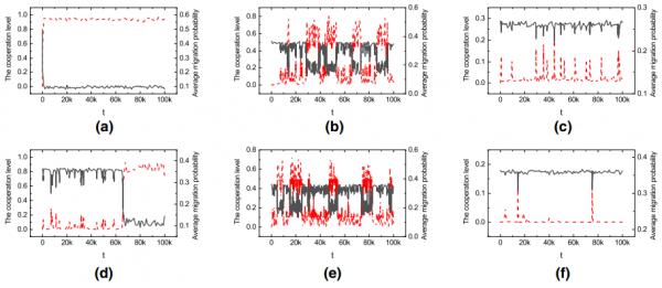 26年来,人们一直试图寻找二策略博弈中策略震荡的证据。西安电子科技大学机电工程学院李智教授团队的青年教师杨志虎,利用共演化方法首次找到了二策略博弈策略震荡的证据,这是继BarrySinervo教授等人发现的三策略震荡之后,首次在二策略博弈中发现循环占优的竞争模式,填补了二策略博弈中策略震荡的空白。研究结果给出了演化系统中有两种策略相互竞争时发生策略震荡的充分条件,并对可能影响策略震荡的主要因素进行了系统分析。该最新研究成果“Oscillation and burst transition of human cooperation”发表在Springer旗下非线性科学领域国际权威杂志Nonlinear Dynamics上。