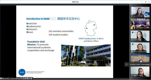 5月25日,由西安交大与德国学术交流中心(DAAD)共同组织,六所德国高校及机构驻华代表处线上召开的“德国高校及机构座谈会”暨“在德国读博及奖学金宣讲会”在线举办。DAAD北京代表处主任施露丝、高级主管任婕,巴伐利亚州大学联盟、亚琛工业大学、弗劳恩霍夫应用研究促进协会、科隆大学及耶拿大学北京办事处代表,物理学院德国籍专家霍迪教授,西安交通大学国际处负责人,以及来自机械学院、数学学院、物理学院、电信学部、外语学院、前沿院及医学部教师代表出席座谈会。学校30多位留德教师在线参加座谈会。